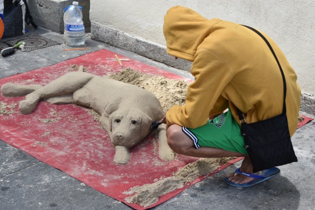 Outside one the piazzas we passed a man with a pile of sand on a tarp. It looked like he was making a sand castle but later when we passed it again, we saw he had created a beautiful dog with glass eyes. I think it looks real.