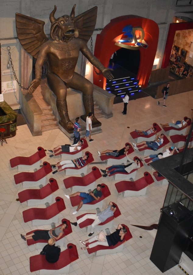 What was truly amazing about the museum was just standing on the balcony that wound its way to the top. At times, the lights dimmed, dramatic music played, and a light show of images played on the ceiling. I was really astounded to discover that the glass elevator we rode on yesterday to the viewing platform, rose up on wires suspended out in the open from the dome as if in a circus. I have never seen anything like it. One of the last exhibits was an Orson Wells film projected on ceiling where people lie on their backs and watch it on the ceiling. I thought that was unusual.