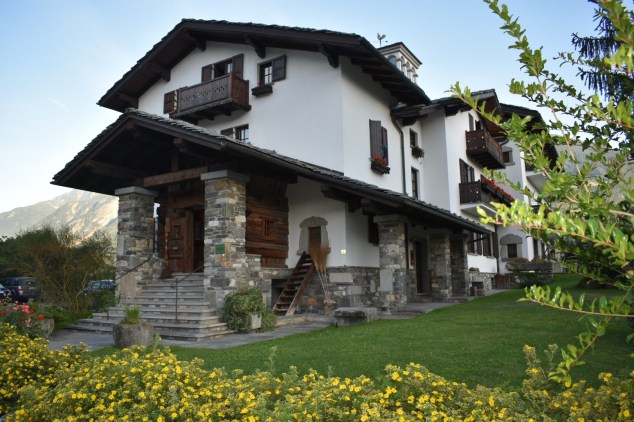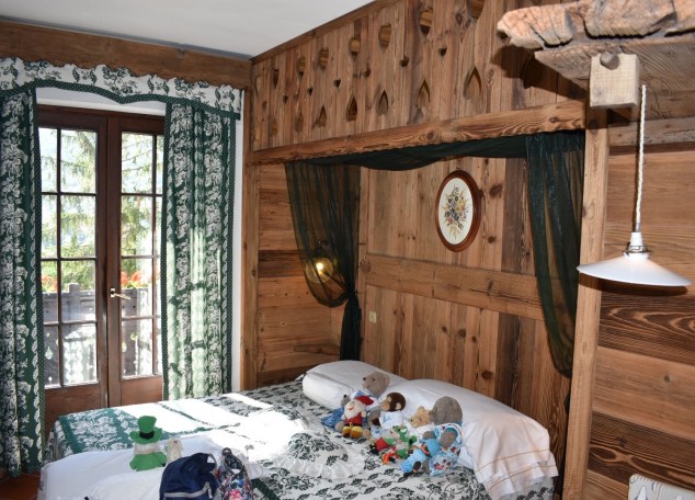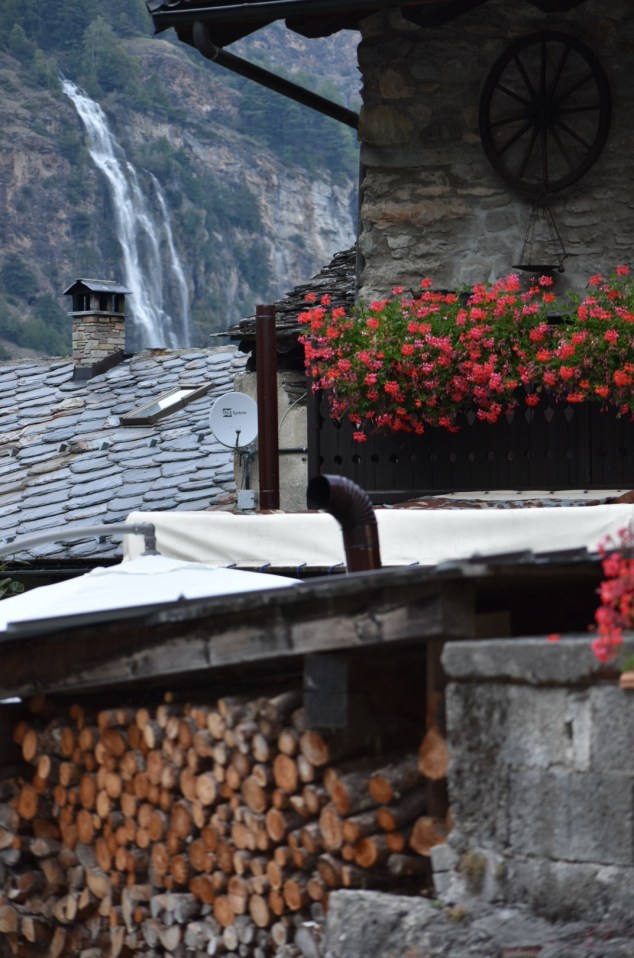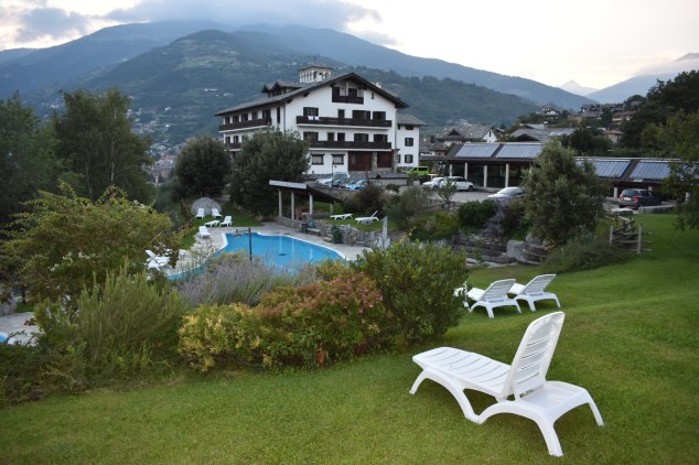 We are staying in a rustic Alpine hotel in the mountains in Aosta. Our room has vaulted ceilings and Alpine decorations, but outside is an ultra modern spa with 3 or 4 pools.