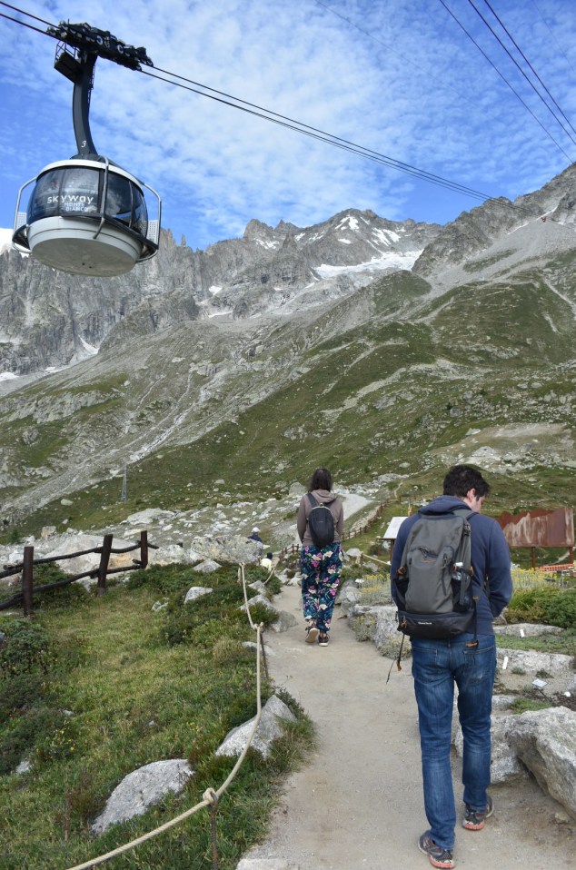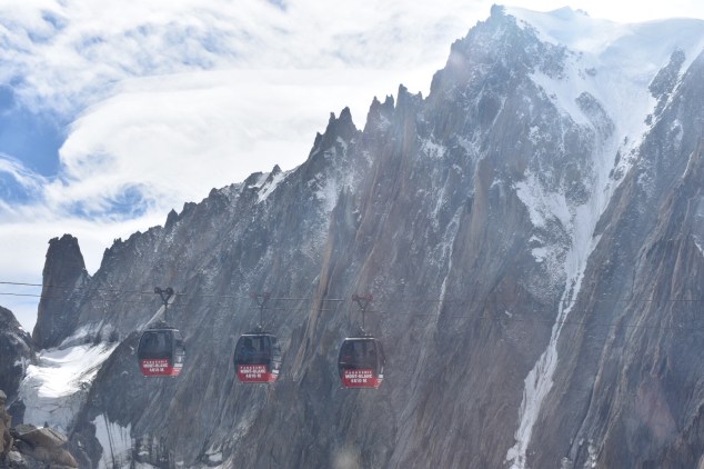 The mountain station on the French side was very busy and freezing cold so David and I got back on the gondolas foe a 40 minutes journey back. It was wonderful. We had our own cable car and each rocky peak we passed seemed bolder, steeper and icier than the previous one. Some had hikers on top, and some stood alone.