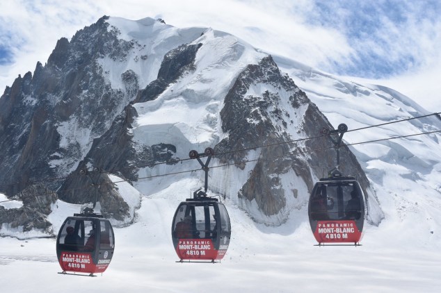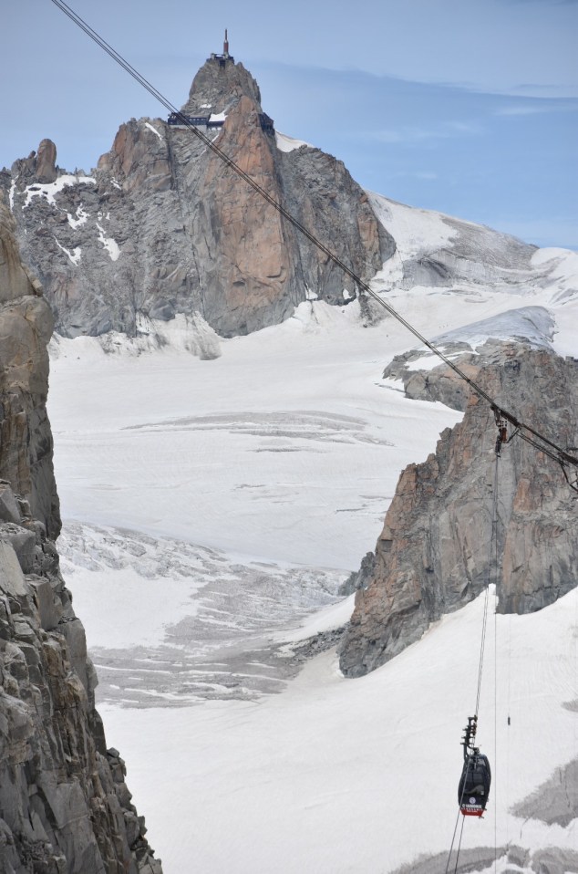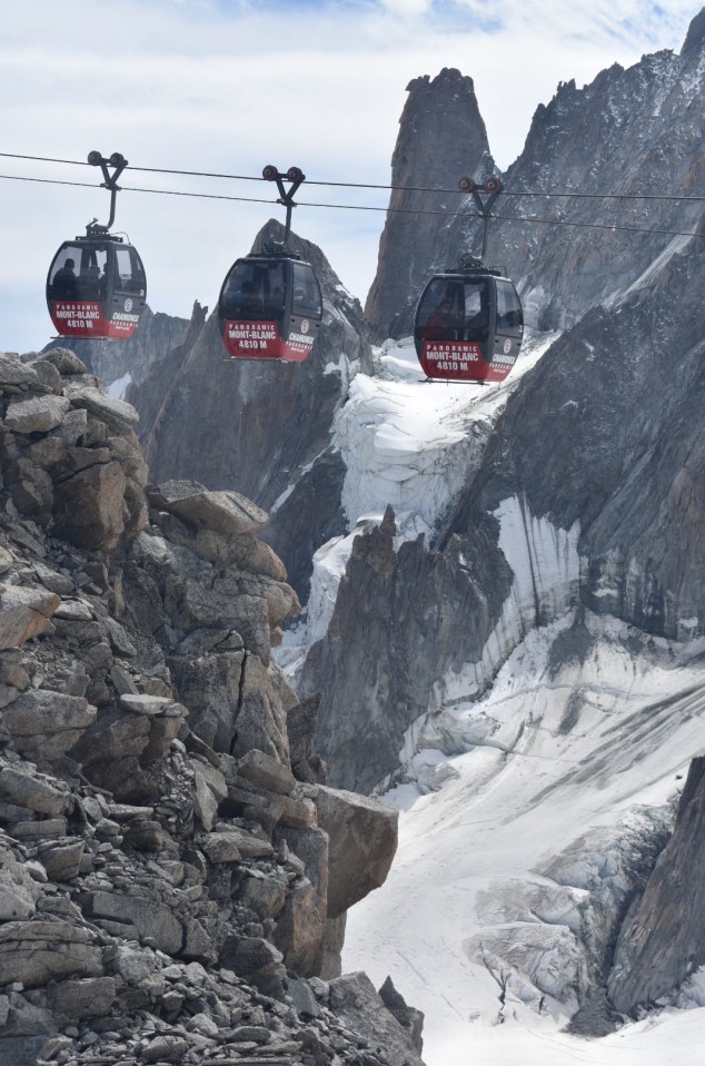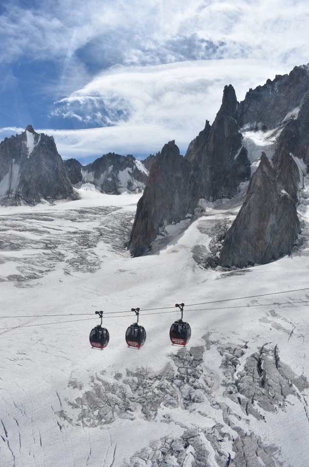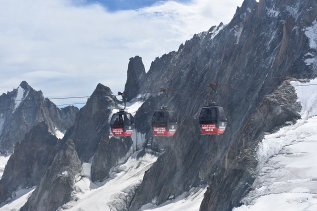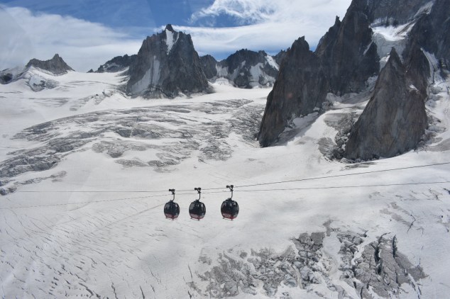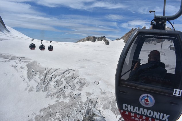 Helbroner is over 11,000 feet in altitude. The altitude can make you dizzy. People looked surprised. For a moment I worried I might black out so we decided to have lunch and that helped. For many, Helbroner is the final destination. It has an amazing view of Mont Blanc, the neighboring peaks, and the valley below, but for us there was one final adventure. Aiguille du Midi Mont Blanc is a trip where cable cars for four people travel for 40 minutes from Italy to the Chamonix mountain station in France. They travel in pairs of three and it’s quite unique because they start and stop leaving you dangling high above the icy world, but that was known to us so we weren’t worried.