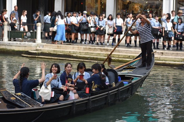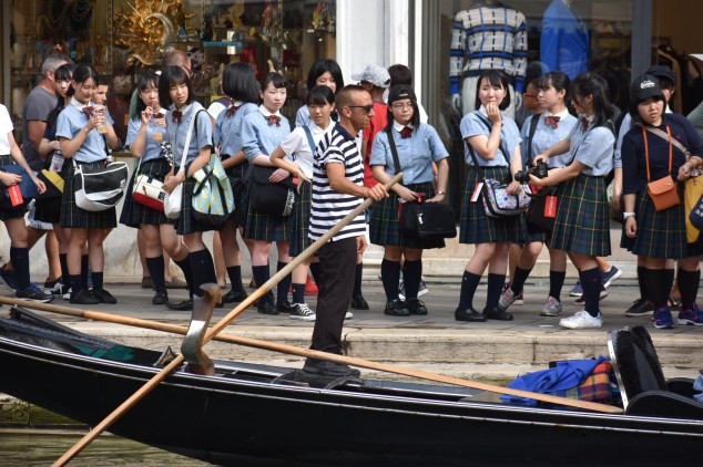 Back in San Marco we visited a glass shop we had been in last year that featured jewelry and glass animals. “We are the second oldest glass store in San Marco,” the owner proudly told us. Outside the store is a stop for gondolas. We saw a large group of Asian school girls all in uniform excitedly boarding the boats and snapping photos.