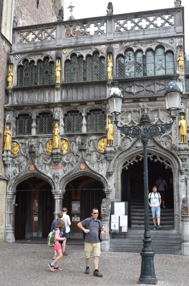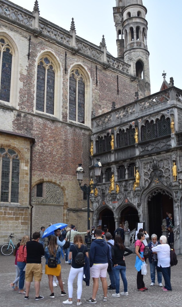 This morning we had a very special experience. We went to the Basilica of the Holy Blood. In the upper chapel is a venerated relic. It’s a vile with cloth containing the blood of Christ brought to the church in the 12th century. We started in the lower chapel where candles were lit and climbed the stairs to the upper chapel where we learned that today we would be able to personally view the relic. It was in a glass box. Usually at places like this people are paraded past the relic, but this experience was different. Each person, couple, or family was invited to step up to the altar, place their hands on the case, and say a personal prayer. For believers this was an emotional experience. Some people bowed down, some knelt before it, others gave the sign of the cross, while others stood in contemplative prayer. I found it very moving and tears flowed thinking about members of our family no longer with us. We learned that this church is part of the Pilgrimage to Santiago de Compostela in northern Spain where we visited several years ago.