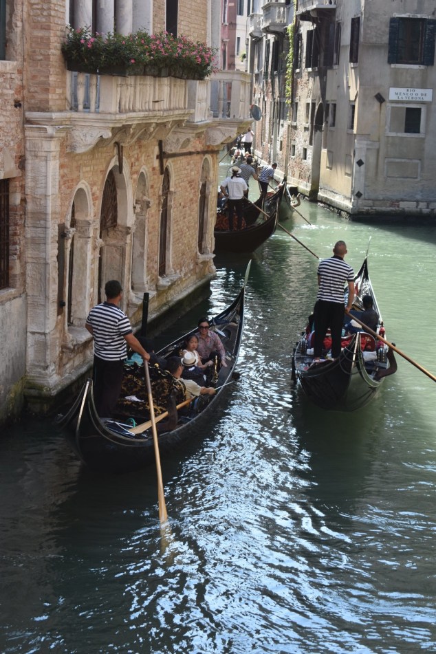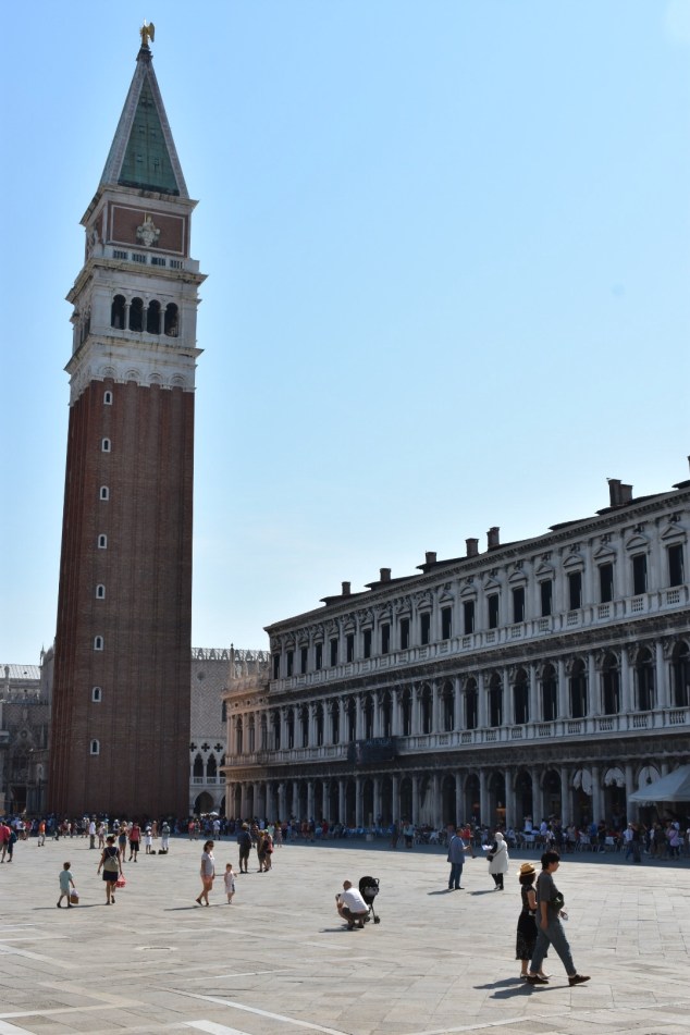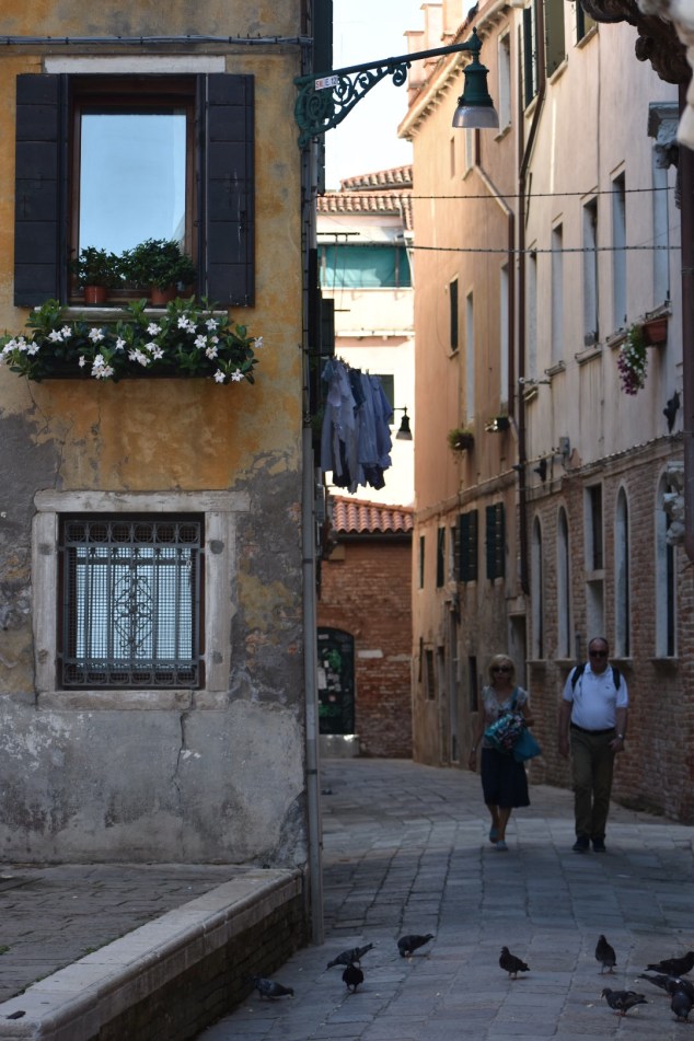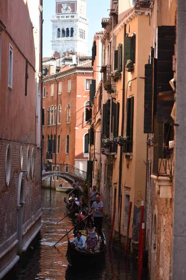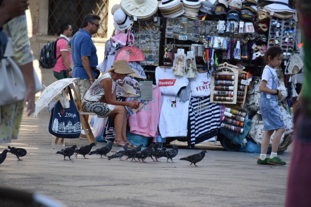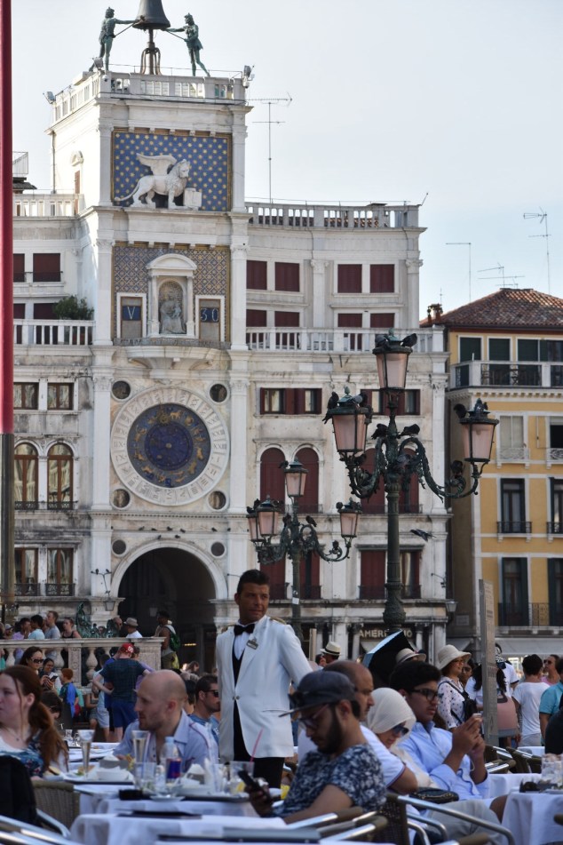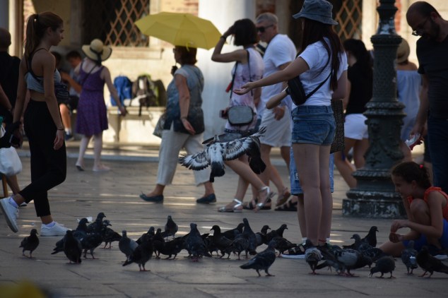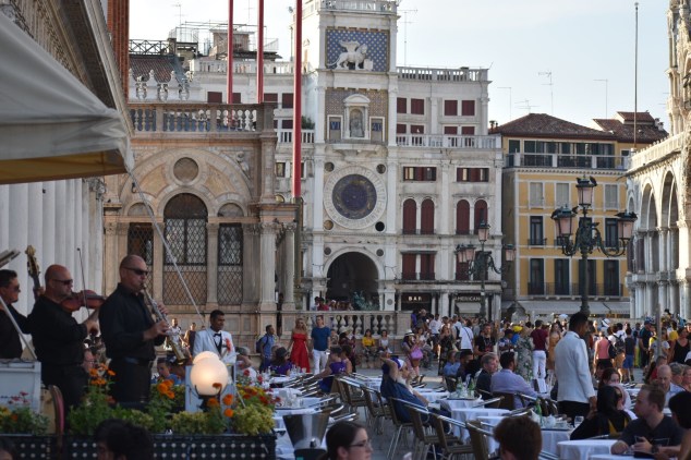 Back at Piazza San Marco we sat outside at a cafe with a live orchestra to people watch. Tour groups full of weary tourists strolled by following guides holding limp flags. Families of small children stopped to feed the pigeons. One family had a pigeon eating on top of a girl’s hat. Selfie sticks are still popular and we sometimes wonder if the people actually look at the monuments they snap pictures of themselves standing by. Bells rang out every hour echoing through the Piazza. We could have stayed there for hours.