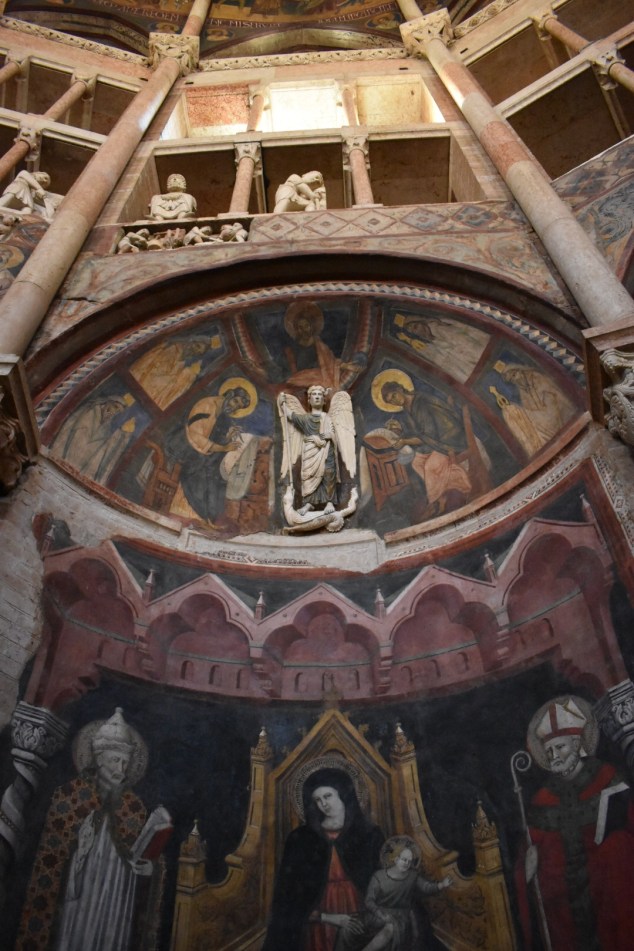 In some of the rooms, modern art was mixed with ancient art. One odd exhibit had television monitors on the floor all showing artists at work, but machine guns were part of it. The explanation was in Italian so I do not know the significance of the display.
